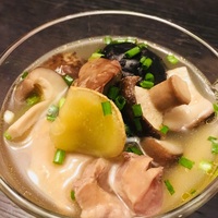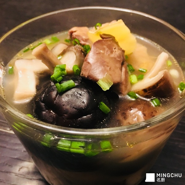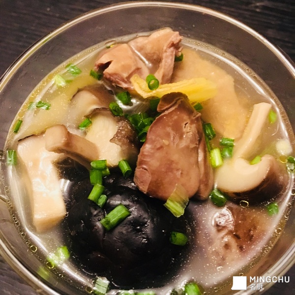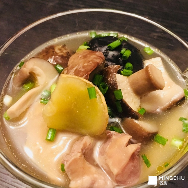取其活鸡宰杀 焯水 配于花菇与其香菇 佐大葱与生姜 旺火煮沸 去其浮沫 文火慢炖两小时之余 少许盐 盛于容器 小葱点缀