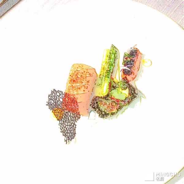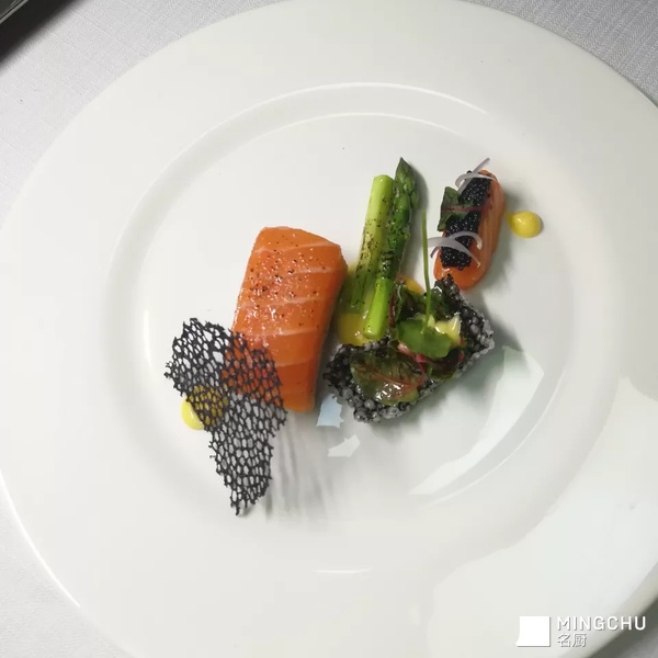 单面煎三文鱼排配穆斯林少司,拼低温三文鱼柳配黑鱼子酱青芥末风味