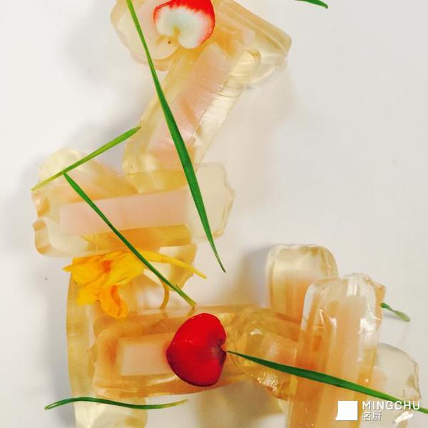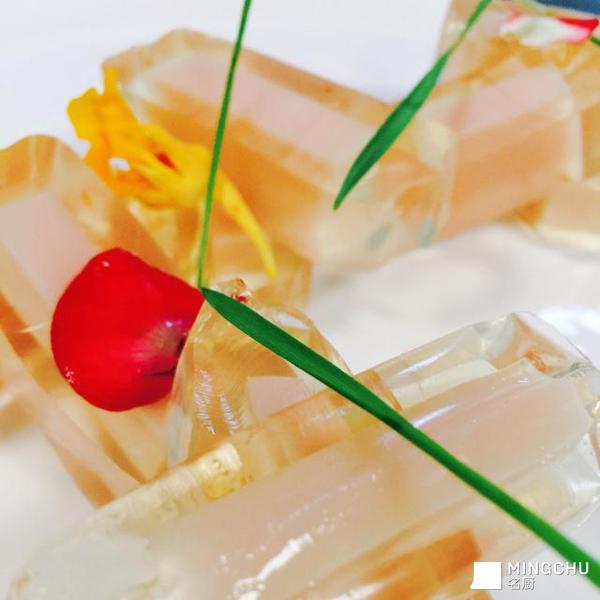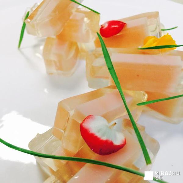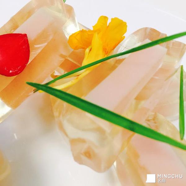 避免使用过多鱼胶粉,否则会产生雾气。使用纯净水能将菜品做得通透无瑕。还要注意的是,请将此菜放入冰箱,经过一晚的冷却和凝固,更能凸显金枪鱼的鲜美。