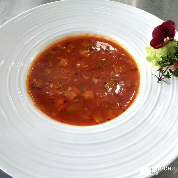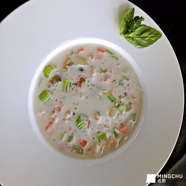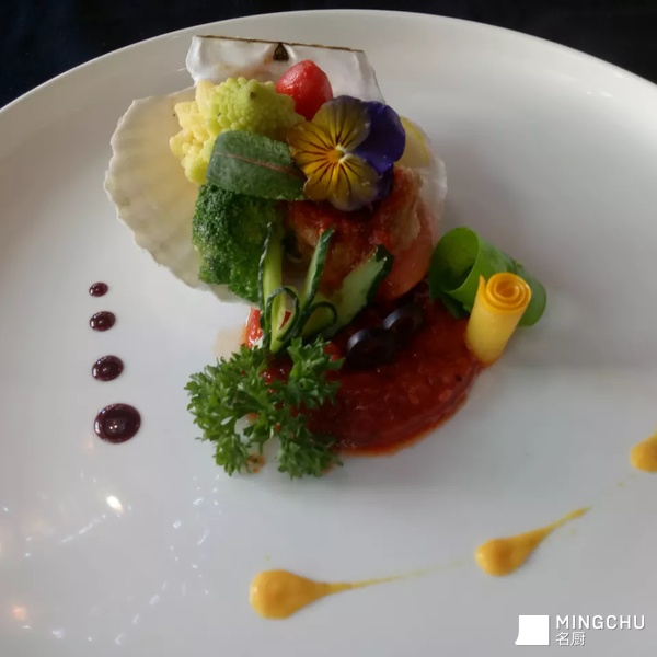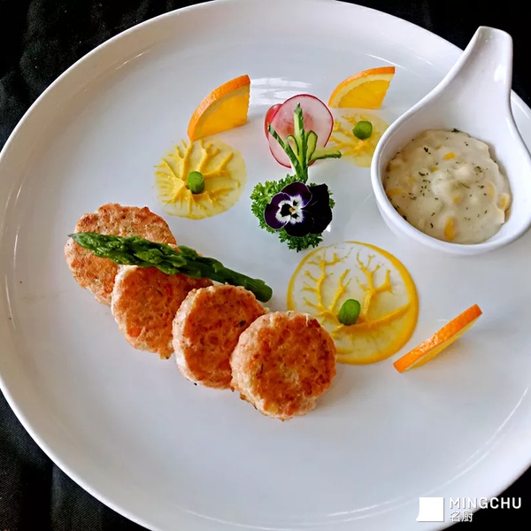 轻煎扇贝配时蔬佐番茄银鱼柳汁、意大利蔬菜汤、海鲜打周汤、香煎三文鱼饼配奶油玉米粒佐甜橙汁