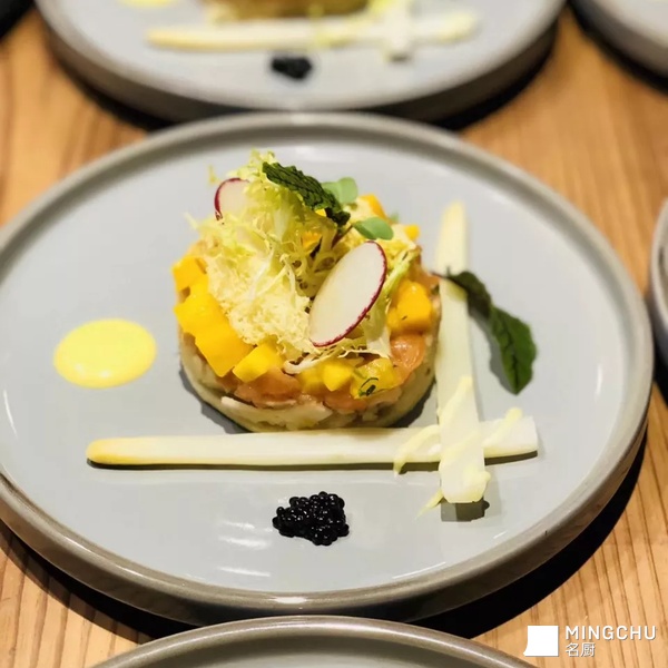 低温慢煮白芦笋配椰奶土豆香茅芒果三文鱼