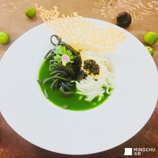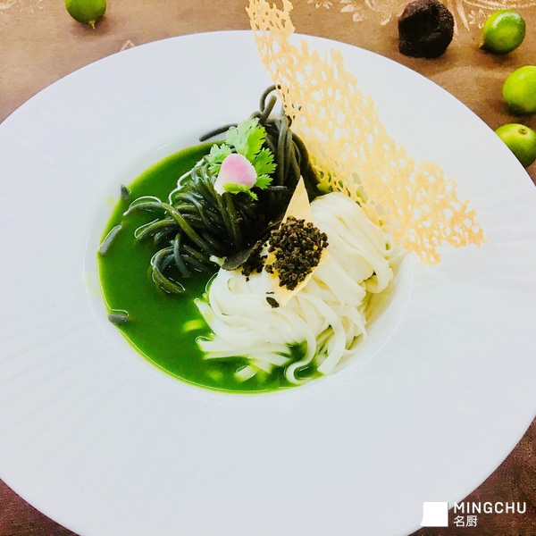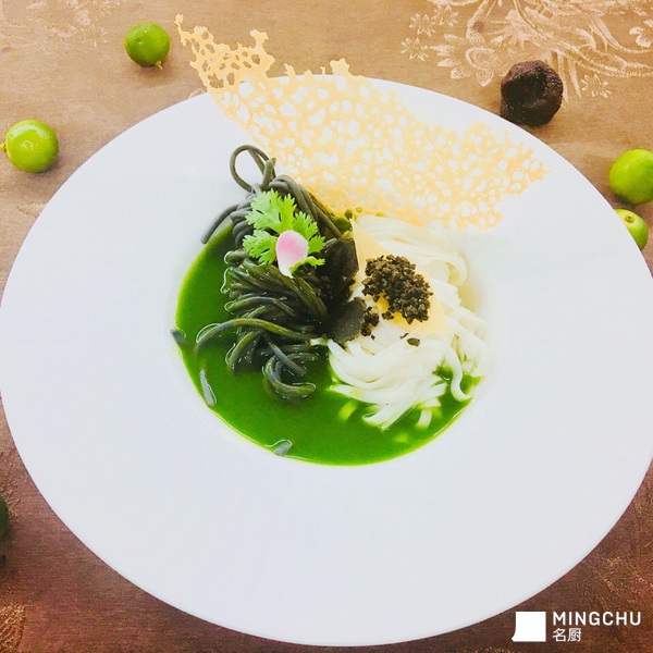 墨魚汁億粉和龍鬚麵成黑白雙色;玉汁碧綠順滑,加入黑松露提高菜品價值。