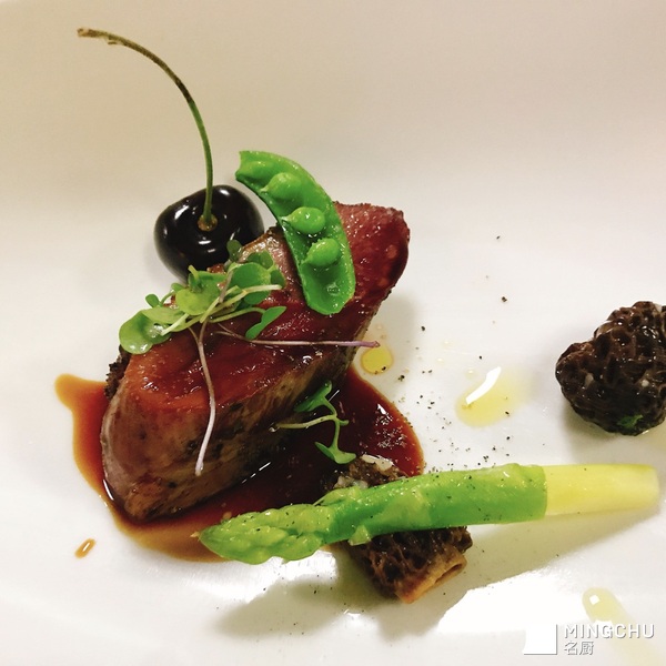 低温法国露杰鸭胸,羊肚菌,铅笔芦笋,青豆,酸樱桃汁