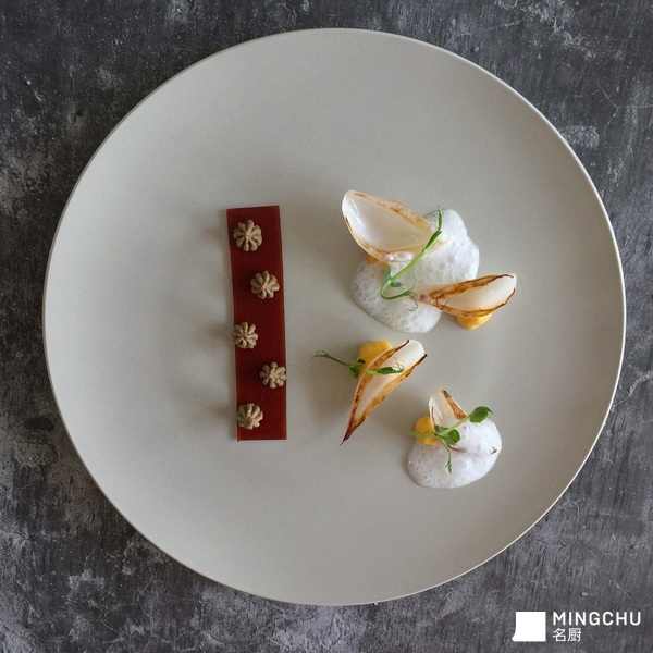 鹅肝慕斯,山楂薄片,炙烤洋葱,南瓜凝胶及酸奶泡沫