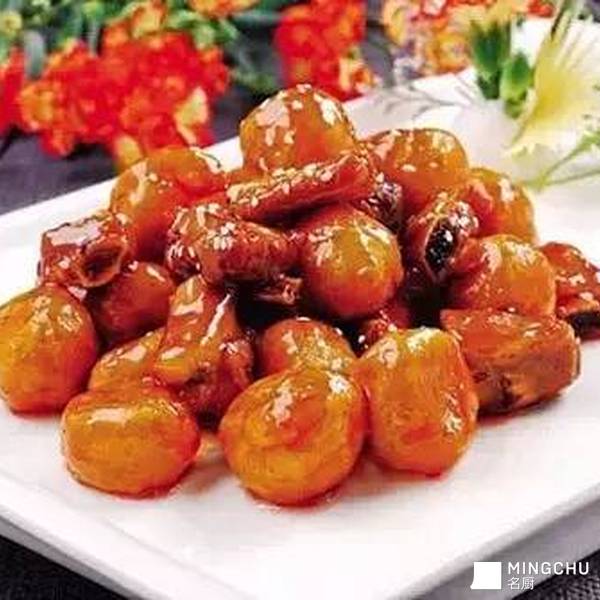 4、锅留底油烧至5成热,下入糖醋小火炒至冒小泡,然后勾芡,再下入芋头球和猪小排翻炒均匀,出锅装盘后洒上白芝麻。
