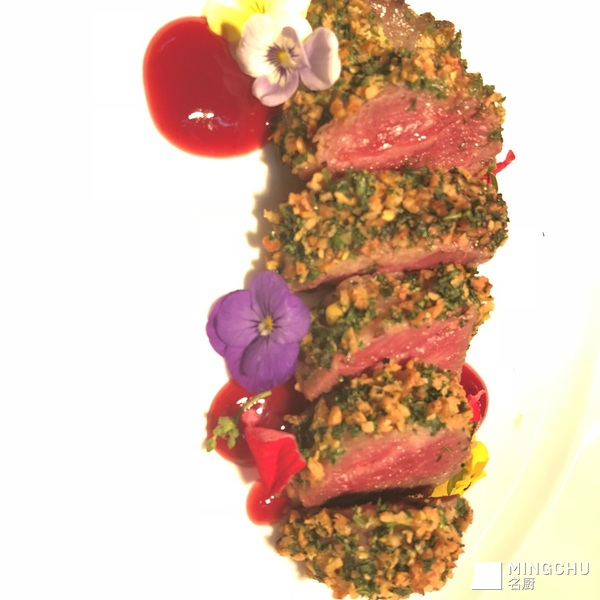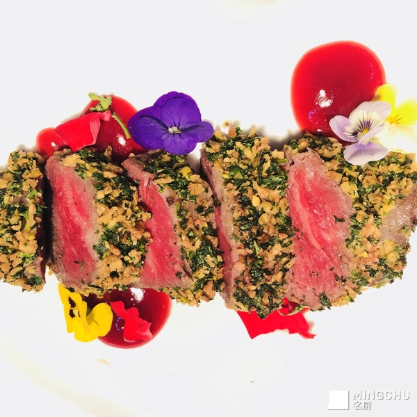 低温三角牛排佐法式香芹椰干碎配红酒汁