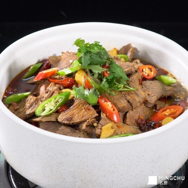 牛肉鲜辣醇香,肉质软烂有韧劲。离三步远,醇香诱人,谓之三步香牛肉砂锅。