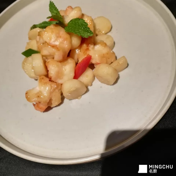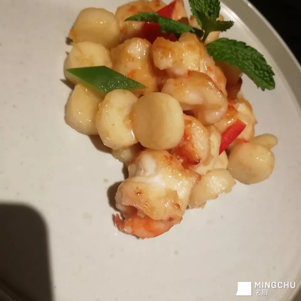 #融合菜 这道菜呢以煎为主 ,山药味甘,性平。有补脾养胃,生津益肺,补肾涩精的作用,虾仁也含有丰富的钙,低脂肪也很养生的一道菜。“ 广东省也有道山药炒虾仁的传统地方名菜,属于粤菜系。风味独特,颇受人们的喜爱。 ”
