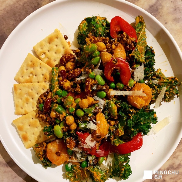 羽衣甘蓝鲜虾沙拉配苏打饼干