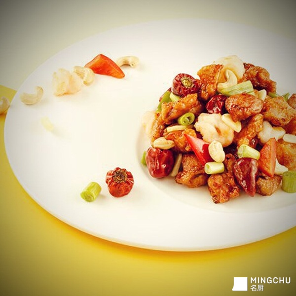 牛蛙和鸡腿切小块上浆 青红辣椒切小粒 牛蛙拍粉炸脆、虾仁和鸡腿过油