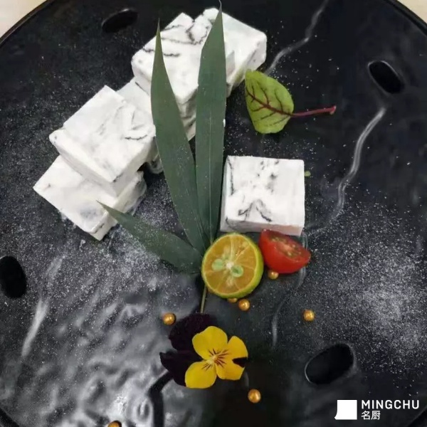 经过传统的甜点加入目鱼汁显得格外漂亮犹如大理石一般
