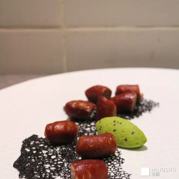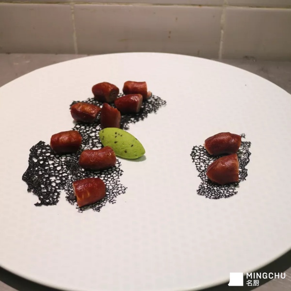 脆皮小肠:质地软烂,口味熏香,皮脆,色泽棕红明亮。