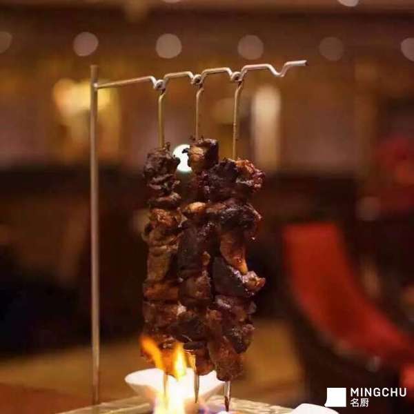用香料将大块肉腌制半个小时以上,180度炉温烤制。上桌前配上煎角瓜片,西红柿片和沾肉酱料。