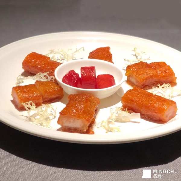 脆皮叉烧脆皮叉烧是一道广东省的特色传统名菜,秘制脆皮叉烧于***年诞生,属于粤菜系烧腊名菜。因为皮脆嫩滑,爽脆、爽口 入口即化的特点。脆皮叉烧的特色就在于皮部色泽金黄,肉眼中透露着麻皮烧猪特有的色泽与之麻皮脆感。脆皮叉烧肉质中,嫩滑到适中,外层是皮爽脆的,而皮爽脆的烧腊成品,内部必须离不开嫩滑。脆皮叉烧选用上乘五花肉中的上五花肉作为烧制原料,做工讲究,火候控制恰到好处。#热卖菜