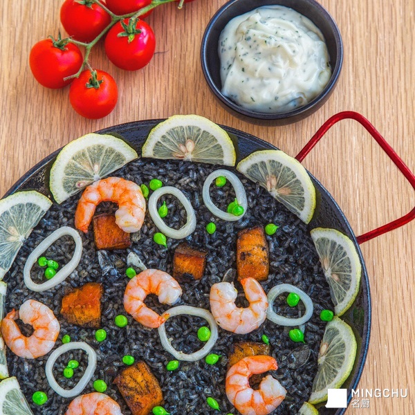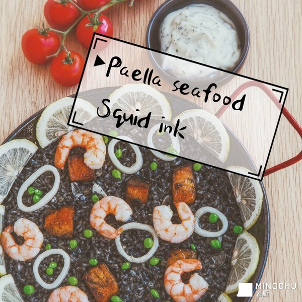 传统的墨鱼汁西班牙🇪🇸海鲜饭!搭配一点蒜味蛋黄酱会更好吃!😋
