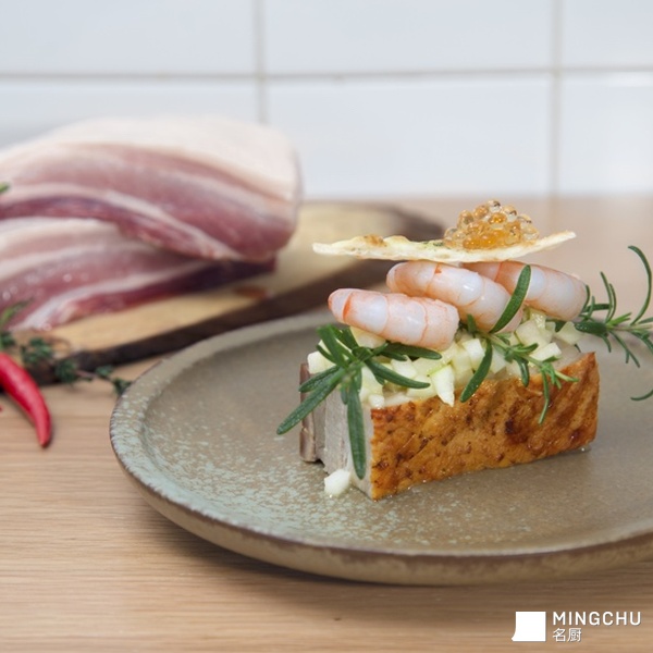 慢烤猪五花配上新鲜大虾!海陆食材的碰撞!新鲜的青苹果调和猪五花的稍许油腻!