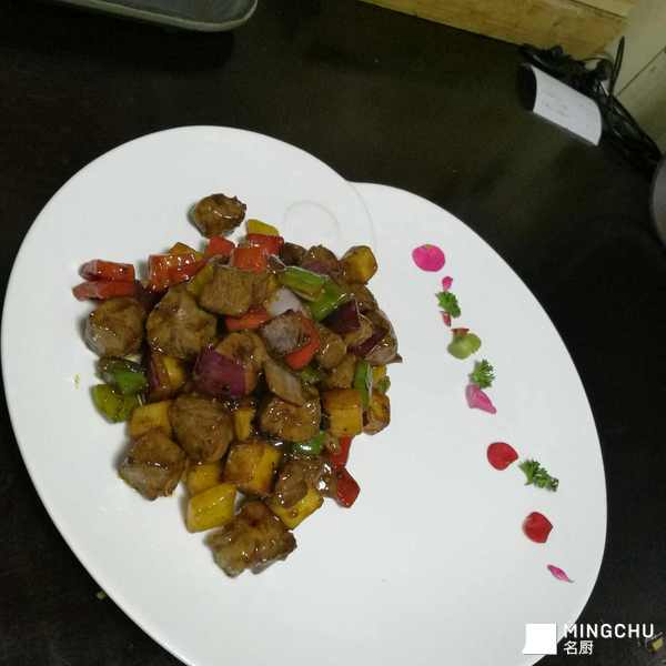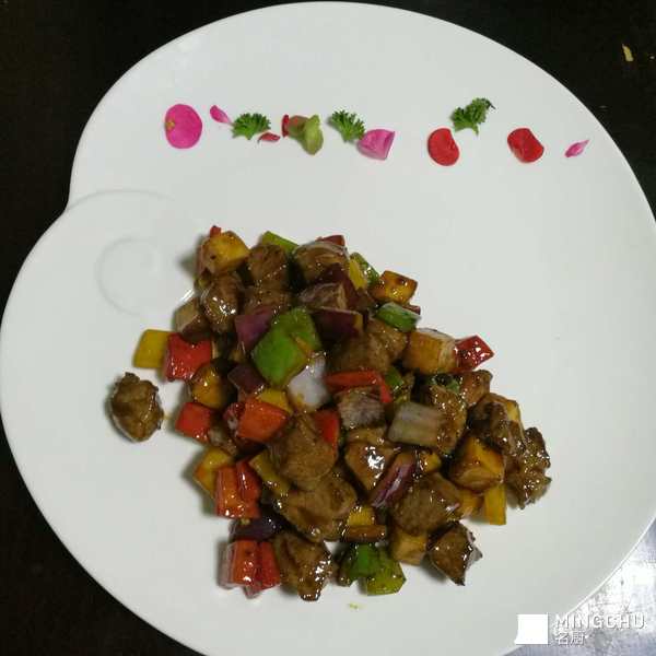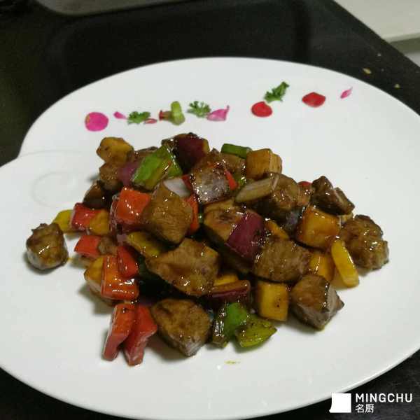 将法国鹅肝与中式烹饪相结合。鹅肝拍粉入锅煎,另起锅入圆葱粒彩椒粒煸香出味,下煎好的鹅肝,加自制黑椒酱翻匀出锅即可。
