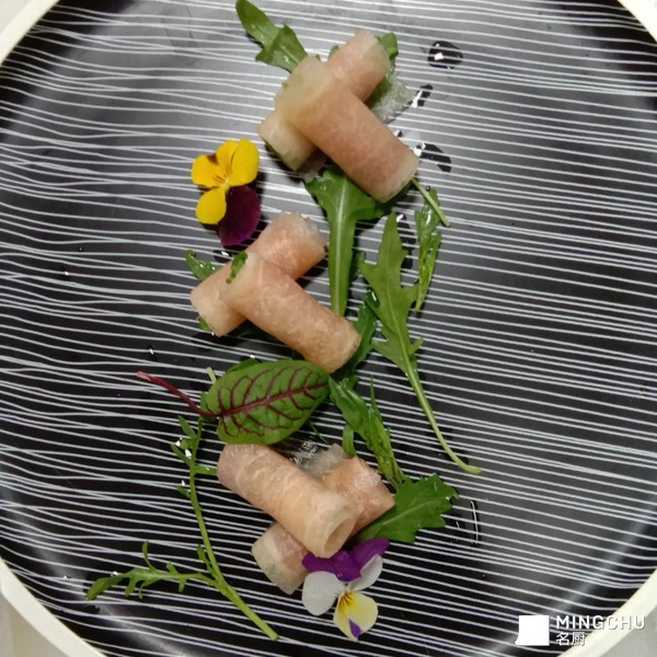 将西班牙火腿卷肉哈密瓜薄片中在加一片芝麻菜,嚼一口回味无穷