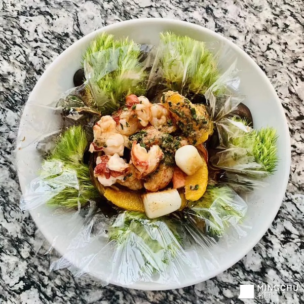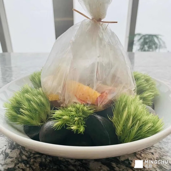 《烟熏纸包龙虾,米糕,茴香,香橙》