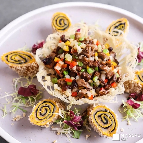 炒鸭松配紫菜蛋黄卷