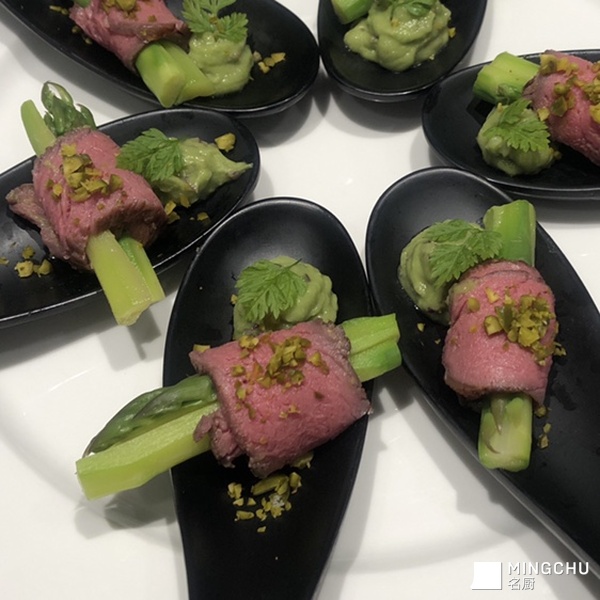 簿切牛肉卷露筍 牛油果醬 開心果碎