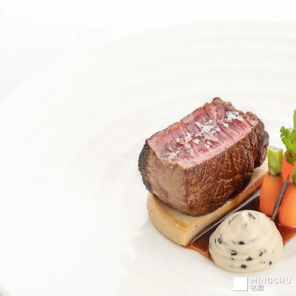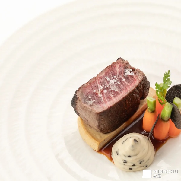 碳烤M3西冷,鹅肝,松露土豆泥,迷你胡萝卜配原味牛肉汁