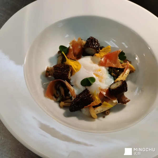 菠菜红米烩饭配温泉蛋羊肚菌风干火腿片