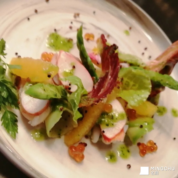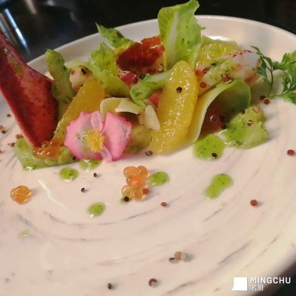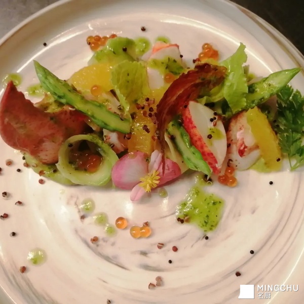 龙虾色拉,牛油果,芦笋,藜麦仁,香橙,伊比利亚火腿脆片,三文鱼籽,香草红酒醋汁