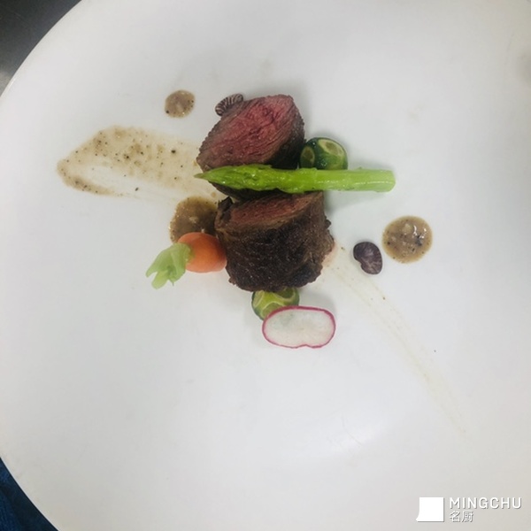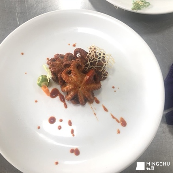 画盘+韩式辣炒八爪鱼+干白煎扇贝肉+香煎牛排配黑椒汁,黑椒汁红酒加少了,颜色不足,后面摆盘用的黑椒汁更好,味道方面偏辣些,减少黑胡椒用量即可