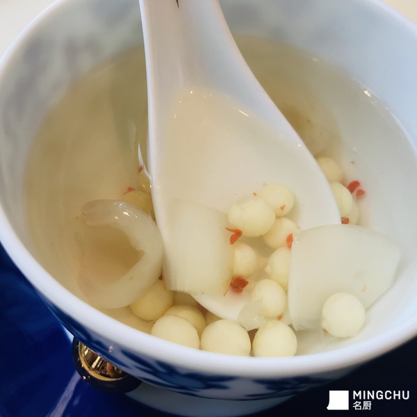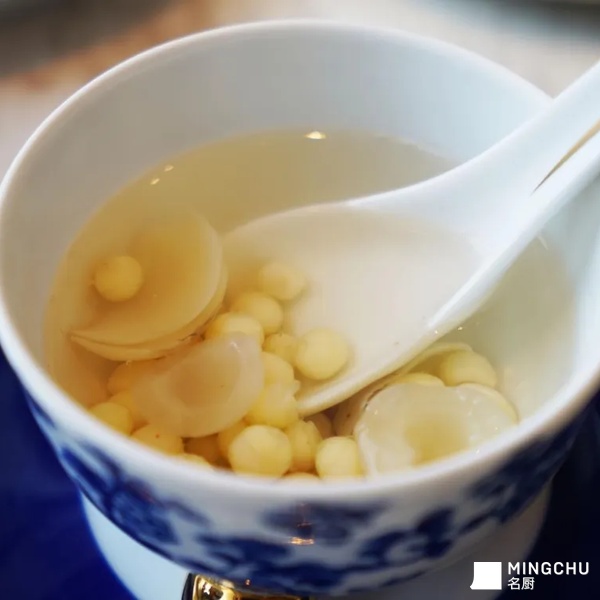 橙红色的丹桂飘散在汤水中,香气沁心,入口甜润,十分惹人喜爱。手剥的新鲜鸡头米炖制得恰到好处,口感饱满、Q弹富有嚼劲,加上清甜的荔枝、百合,层次颇为丰富。#小7探店 #米其林餐厅 #新荣记 #北京