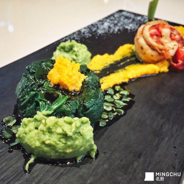 鳄梨又称牛油果,有健胃清肠的功效,富含植物脂肪,有“森林奶油”之称,搭配红魔虾口感上更加丰富,南瓜泥和菠菜的搭配使得这道菜从颜色,口感,营养上有了新的突破。