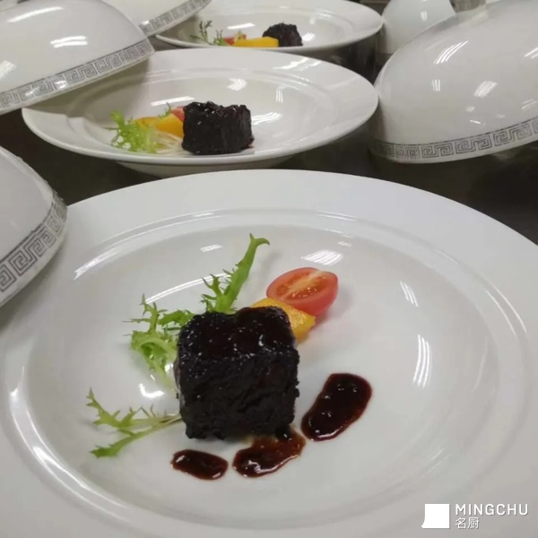 雪花牛改刀大块后,净毛巾吸水后,黄油煎香备用。锅中下汤,调入特朗尼黑醋,长城干红葡萄酒、生抽、冰糖、桂皮八角陈皮烧开,文火一个半小时后,收汁下入蜂蜜柠檬丝出锅装盘。慢火煨透的牛肉,口感滋润、色泽透亮,临出锅加上蜂蜜的色度,呈现自来芡的效果,配以时令水果和蔬菜烘托色调,整道菜口感嫩滑爽口,特朗尼黑醋作用于牛肉的纤维软化,合理的降低脂肪影响,很符合当下的餐饮理念注意餐具加热保温的效果,更有利于牛肉的口感和香气