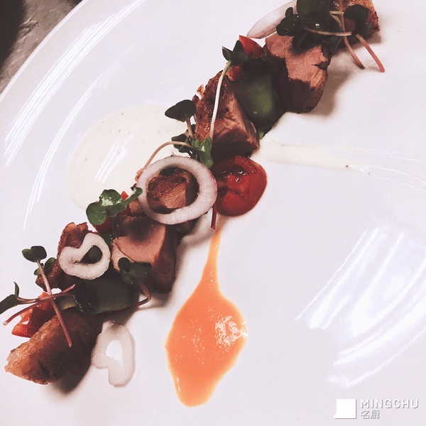 开胃鸭胸暖色拉配萝卜苗及红椒汁和奶油黑椒汁