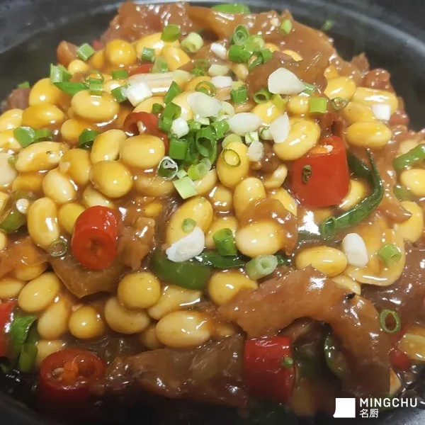 发好的蹄筋切条,黄豆煮熟。热锅加油烧至80度把蹄筋拉一下油倒出备用,锅底流油下葱姜蒜线椒美人椒段和黄豆酱煸香,下蹄筋和黄豆翻炒,再加入家乐淡盐鸡粉,家乐辣鲜露和家乐蒸鱼豉油,少许高汤顿一下收汁装盘即可