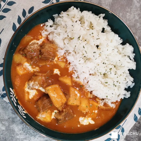 泰国的咖喱有浓浓的香茅和椰汁的香辣味日本的咖喱带点蔬菜的甜香,入口顺滑欧洲的咖喱带点奶香,还有奶油的味道那如果把他们溶合到一齐呢?用了泰国和日本的咖喱做底,用澳洲牛肋条肉做汤配合。添加香茅等香料慢熬1个半小时。最后加入苹果粒增加口感带点清香。最后上盘加奶油点聚。