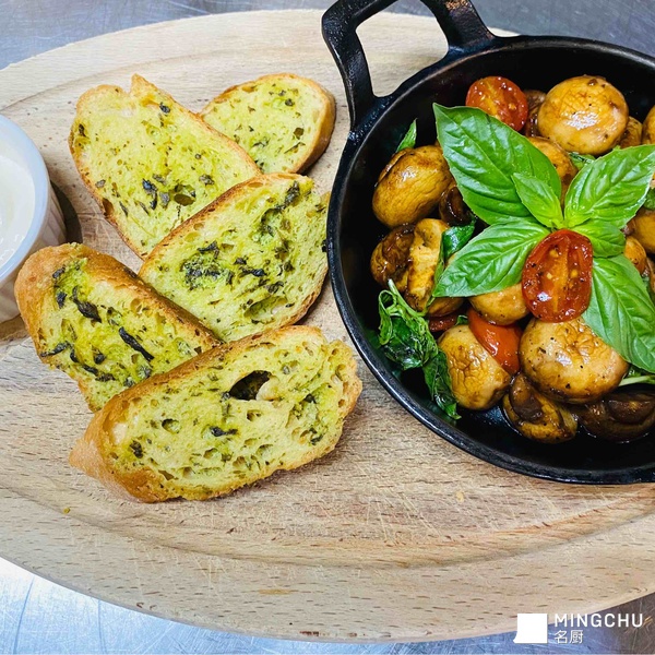 高溫炒蘑菇搭配陳年巴薩米克醋嗆香,蘑菇沾取酸奶美乃滋味道更特別。