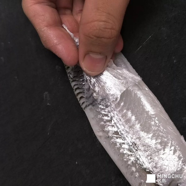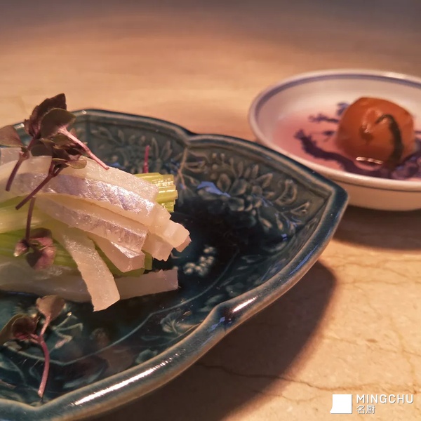 江戶時代醬油還沒有普及的時候,煎酒是庶民重要的調味料。 在日本酒中加入漬梅乾跟柴魚片,用小火慢慢煮出優雅的味道,適合突顯出食材原本淡雅的味道。 水針魚用塩跟醋漬過後切成絲,搭配芹菜清脆的口感跟清爽的香氣。
