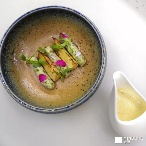 扇贝与海带芽入搅拌机打碎,加蛋清,海盐,白胡椒,青柠皮,保鲜膜定形,蒸6min,霜降,改刀,刷味噌焦黄油烤热!冬笋白萝卜水加入辣椒干煮后换米汤煮至去涩苦味后,添加鱼汤,奶油海盐煮至入味!改刀后用黄油煎至上色,撒少许盐!冬笋三道煮汁与笋衣和笋边料打细腻加入黄油乳化制成酱汁!