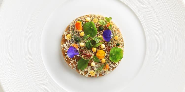 创意来自意大利名菜carpaccio,用柔嫩的熟牛肉代替传统的薄切生肉。菜品由下至上5种层次的滋味逐级叠加。底部是与香草一起煮制的牛肉,口感细润,上面是一层透亮滑爽的啫喱,中间点缀了5种不同颜色不同滋味的酱料,其中用柠檬调味,搭配蜂巢般的薄脆,以及花朵、香草与叶片。缤纷满目,口中春意盎然。