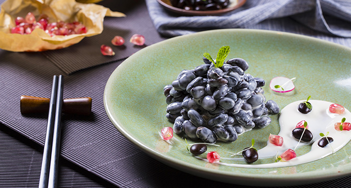 牛油果蔬菜沙拉富含纤维,有降低胆固醇和血脂、保护眼睛、保护心血管和肝脏系统等重要生理功能,其中牛油果健康营养,是公认的优质健康食材;百花小米酿辽参具有温补功效,辽参含有丰富的蛋白质,可补肾益精、养血润燥;小米含有维生素及其他矿物质元素,适合人体消化吸收,能减肥、降血脂、降血糖。二者的结合将植物蛋白与动物蛋白巧妙搭配,又加入上汤调味,让客人品尝到鲜美滋味的同时达到食补的效果。