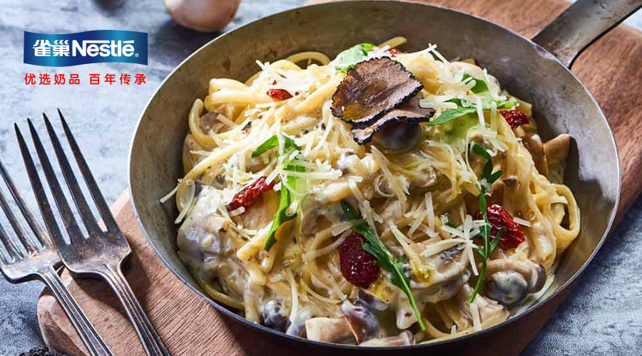 这之外,酱汁的调配也至关重要,淡奶油作为非常敏感的产品,非常容易分离。雀巢烹饪淡奶油不仅在加热过程中非常稳定,更能保证较好的包裹性。酱汁完美包裹着意面,每一口都有着奶油和松露的双重香气。