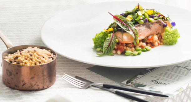 阿布素珍珠意面搭配多种圆形食材,如茨实、青豆仁、毛豆仁,口感和造型相协调。意面煮9分钟,不过水,喷酒增香,以烩制方式收汁。三文鱼加料腌制5分钟,抽真空,以46℃低温煮制12分钟。各种食材共同打造丰富口感。