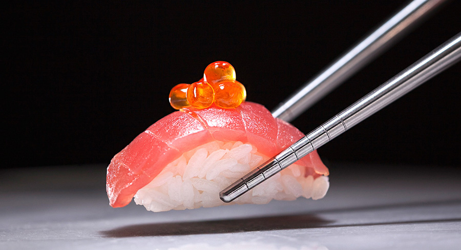 料理金枪鱼时他会先观察鱼肉的纤维走势,以滑曳的切割方法将鱼肉顺势切片,为的是尽量利用自然之力,减少反复推拉时带来的水分流失,从而保持鱼肉的最佳口感。