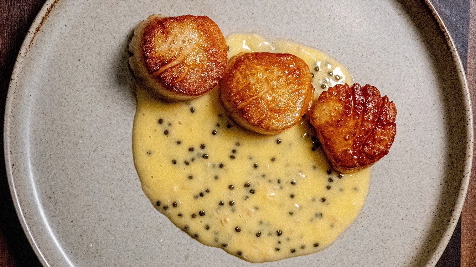 主厨 Ross Deutsch 也制作了一款加入鱼子酱的白黄油酱汁,搭配香煎扇贝。浓郁与清爽的风味彼此融合,相得益彰。