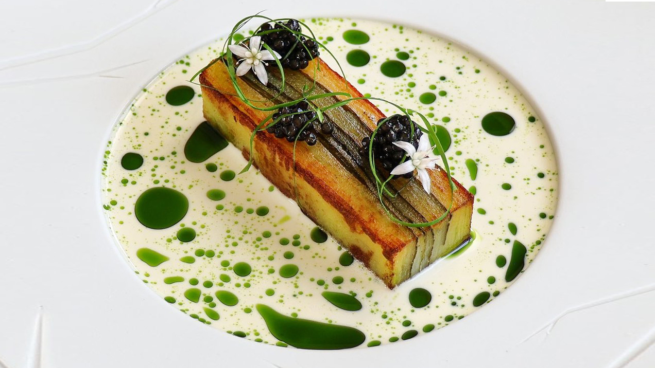 👆 点击观看:制作脆皮土豆泥,鱼子酱,野蒜,白黄油酱汁。© Thomas Pedevilla