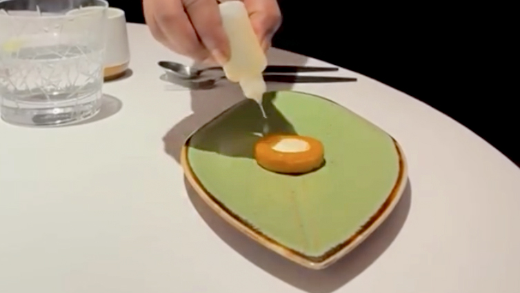 蒸蛋饼拥有舒芙蕾般的柔软口感,搭配奥西特拉鲟鱼子酱,同时佐以欧芹酱汁与鱼子酱汁。料理上桌时,主厨将绿色与深色酱汁一起倒入盘中,让欧芹的清新草本与鱼子酱的海洋气息相碰撞,精致而有趣。
