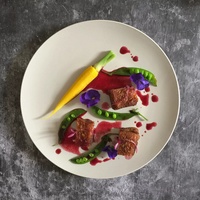 低温鸭胸配双色芦笋,红薯泥及蘑菇汁