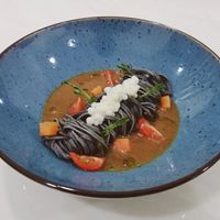 黑竹炭意面,特制咖喱酱,豆奶晶球