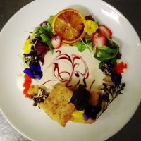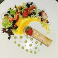 烟熏鸭胸配新鲜芒果酱,阿拉伯色拉,奶油草莓