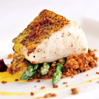 香煎银鳕鱼配番茄烩兰度豆、黄油芦笋及海鲜汁